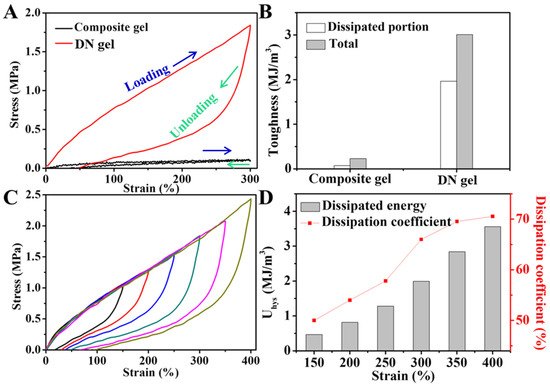 (A) Loading–unloading curves of composite and DN hydrogels at a strain of 300% and (B) their corresponding calculated dissipated energy and energy-dissipation coefficient. (C) Loading–unloading curves of DN hydrogel at different strains (150%, 200%, 250%, 300%, 350%, and 400%) and (D) corresponding calculated dissipated energy and energy-dissipation coefficient.