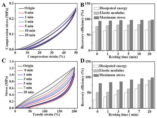 (A) Self-recovery behavior and (B) self-recovery efficiency upon compression. (C) Self-recovery behavior and (D) self-recovery efficiency upon elongation.