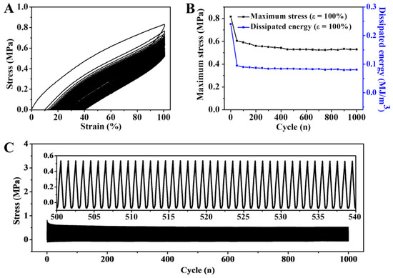 (A) 1000 continuous elongation–relaxation cycles of the DN hydrogel. (B) The evolution of maximal stress and dissipated energy during 1000 cycles. (C) Real-time stress curve during a continuous 1000 cycles at a strain of 100%. The built-in figure was the stress curve during the 500th to 540th cycles.