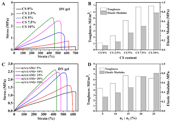 (A) The stress–strain curves of the DN hydrogels with various CS content and (B) their corresponding toughness and elastic modulus. (C) The stress–strain curves of the DN hydrogels with various molar ratios of AA to AM (n1:n2) and (D) their corresponding toughness and elastic modulus.