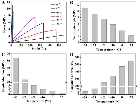 (A) The stress–strain curves and the detailed mechanical property parameters of the DN hydrogel at different temperatures: (B) tensile strength, (C) elastic modulus, and (D) fracture strain.