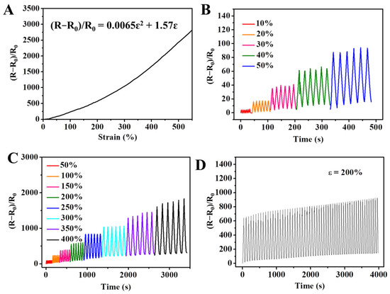The performance of the DN hydrogel sensor: (A) relationship between resistance variation and tensile strain; (B,C) relative resistance-variation curves of multiple tensile strains; (D) real-time resistance-variation curves within 60 cycles (ɛ = 200%).
