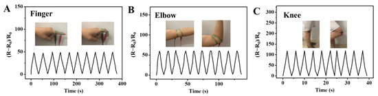Monitoring of human body movements: (A) finger bending, (B) elbow bending, and (C) knee bending.