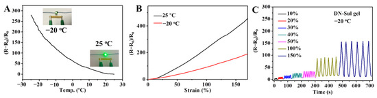 As demonstrated, the DN hydrogel showed outstanding mechanical properties at sub-zero temperatures. Furthermore, the cryogenic sensitivity of the hydrogel was also investigated. An LED bulb connected to a circuit containing a piece of hydrogel was used to study the conductivity (Figure S6). As shown in Figure 10A, the conductivity of the hydrogel varied inversely with the temperature. When the temperature decreased, the migration of ions was impeded due to the limited movement of the polymer chains and the crystallization of water molecules. Figure 10B shows the response–strain curves of the gel sensors at 25 °C and −20 °C. Compared with the response value at normal temperatures, the response value at −20 °C was reduced to a certain extent. However, the gel sensor could still be utilized at low temperatures, as the response to 150% strain rose to 160%. Figure 10C illustrates the continuous response to the tensile strain ranging from 10% to 150% at −20 °C. The repeated curves at each strain demonstrated the excellent stability of the hydrogel sensor.