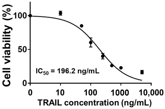 TRAIL is a well-known TNF family member that can induce apoptosis of cancer cells without showing toxicity to normal cells [22]. Binding of TRAIL to death receptor (DR) 4 or DR5 can activate caspase-8, which in turn stimulates caspase-3. Thus, a caspase-mediated extrinsic apoptosis pathway is triggered, leading to cancer cell death. Furthermore, TRAIL triggers another intrinsic apoptosis mechanism. Caspase-8 activated by TRAIL induces cytochrome C release from mitochondria. Released cytochrome C then promotes the formation of apoptosome, leading to caspase-9-mediated apoptosis [23,24]. Due to these characteristics, TRAIL is considered as an alternative anticancer drug candidate. In this study, HCT-116 cells exhibited TRAIL-concentration-dependent cell death. Specifically, at a concentration of 10 ng/mL or less, TRAIL had no significant effect on cell viability. Its IC50 value was 196.2 ng/mL (Figure 1). Additionally, a previous study has demonstrated that HCT-116 cells show higher expression levels of both DR4 and DR5 than A549, HT-29, and Jurkat cells. Higher TRAIL-sensitive apoptosis was correspondingly observed [25]. This higher sensitivity of HCT-116 cells to TRAIL compared to HT-29, SW480, and SW620 cells has also been observed in other studies [26]. Consequently, in this study, HCT-116 was selected as a target for TRAIL-mediated anticancer treatment and used in subsequent experiments.