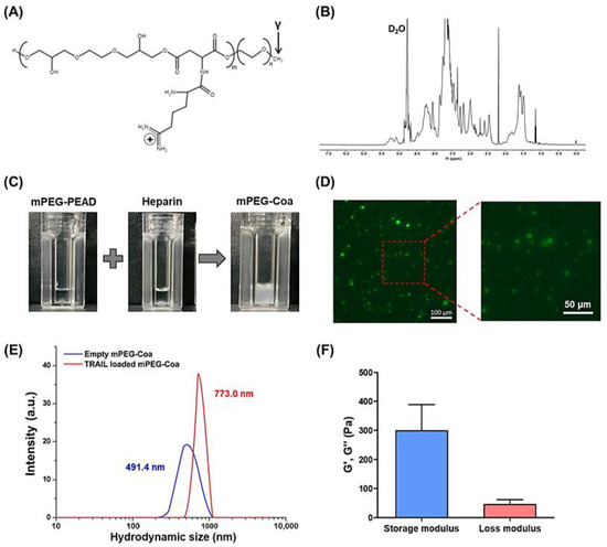 Characterization of mPEG-PEAD and mPEG-Coa. (A) Chemical structure of mPEG-PEAD and (B) structural analysis using 1H-NMR. (C) Macroscopic observation of mPEG-PEAD, heparin, and mPEG-Coa and (D) fluorescence image of mPEG-Coa. (E) Hydrodynamic size of empty mPEG-Coa and TRAIL-loaded mPEG-Coa. (F) Viscoelastic properties of mPEG-PEAD.