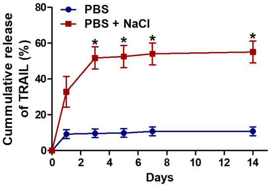 Release profile of TRAIL from mPEG-Coa in PBS (135 mM NaCl) and PBS supplemented with additional NaCl (total 185 mM NaCl). (*) indicates a significant difference as compared with PBS group.