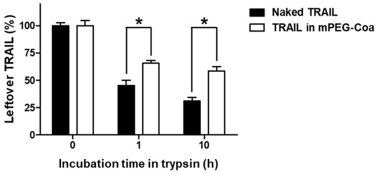 An ideal drug delivery system should also be able to protect the cargo molecule from the stimuli in external environments. In particular, TRAIL has a very short in vivo half-life (3–5 min in mice and 30–60 min in primates) [12,29]. Consequently, in most studies, TRAIL administered directly into the blood vessel is degraded before functioning. High-dose and/or multiple administrations of TRAIL are required to achieve the intended therapeutic efficacy. Therefore, the development of a delivery carrier with sufficient protective capability for incorporated cargo drugs until it reaches the target tumor is necessary. To evaluate the cargo protection ability of mPEG-Coa, naked TRAIL and TRAIL-loaded mPEG-Coa were incubated with trypsin for 10 h (Figure 4). As a result, after 10 h of incubation with trypsin, 31.0% of naked TRAIL without any protection remained. On the other hand, in the TRAIL-loaded mPEG-Coa group, 58.6% of cargo TRIAL was preserved by the protection of mPEG-Coa carriers. These results demonstrat that our mPEG-Coa could efficiently protect cargo TRAIL from the harsh external environment containing protease. Previous studies have also demonstrated similar results for Coa-mediated protection of cargo fibroblast growth factor-2 or interleukin-12 and preservation of their bioactivities in the presence of trypsin [30,31]. Collectively, with a differentiated release profile (Figure 3), it could be anticipated that the protective efficacy of mPEG-Coa (Figure 4) could improve therapeutic outcomes of exogenous TRAIL delivery in TME with high levels of extracellular proteolytic enzymes [32].