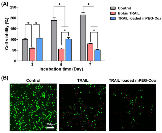 Inhibition of colon cancer recurrence via mPEG-Coa-mediated TRAIL delivery. (A) Viability of HCT-116 cells and (B) live/dead fluorescence microscope images after 7 days of treatment. (*) indicates that the experimental group is statistically different to indicated experimental groups.