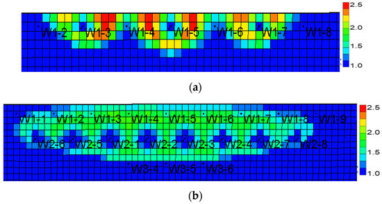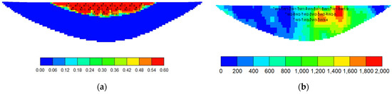 Distribution of polymer concentration under different water volumetric multiples. (a) Polymer concentration with the water volumetric multiple of 50. (b) Polymer concentration with the water volumetric multiple of 200.