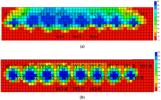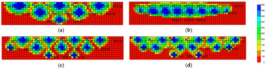 Polymer distribution of different well patterns. (a) Inverted seven-spot (injector–producer ratio 6:14). (b) Staggered (injector–producer ratio 8:12). (c) Five-spot (injector–producer ratio 10:10). (d) Seven-spot (injector–producer ratio 14:6).