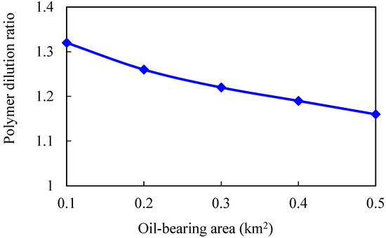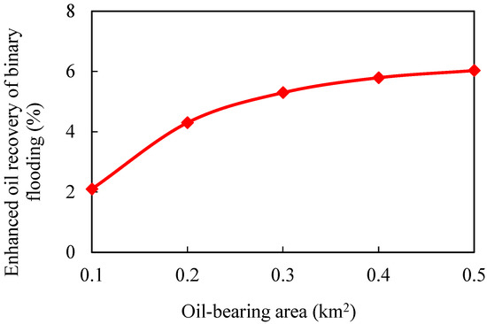The larger the oil-bearing area is, the more perfect the displacement well pattern is. When the oil-bearing area is 0.1 km2, the well row is a row, so the regular area well pattern cannot be formed. Moreover, the oil well is close to the water boundary, which means that the water invasion multiple is large, and the polymer solubility will be significantly diluted. With the increase in oil-bearing area, water influx and dilution ratio of chemical agent in binary flooding stage gradually decrease, while enhanced oil recovery gradually increases. When the oil-bearing area is greater than 0.2 km2, the increase in enhanced oil recovery slows down.