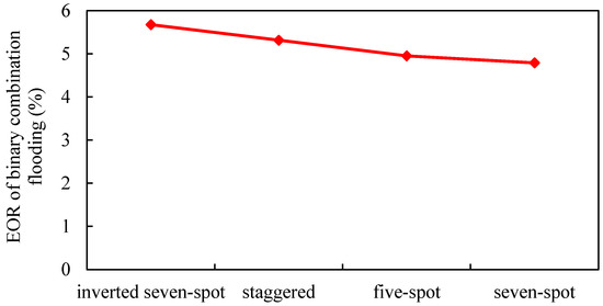 The sweep coefficient of the inverted seven-spot well pattern is the largest, so the binary combination flooding effect is the best [40]. The staggered well pattern is the second and the seven-spot pattern is the worst. Compared with the inverted seven-spot pattern, the enhanced oil recovery and sweep coefficient of the seven-spot pattern decreased by 15.1% and 20.7%, respectively, and the decline rate of enhanced oil recovery is smaller than that of the sweep coefficient. The main reason is that from the inverted seven-spot well pattern to the seven-spot well pattern, the injection–production well ratio gradually increases and the invasion of edge water gradually decreases.