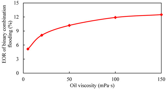 With the increase in oil viscosity, the difference in the oil–water mobility ratio becomes larger, the oil recovery decreases in the edge water flooding stage, and the remaining oil after the edge water flooding stage is large. The gel-assisted polymer and surfactant binary flooding can improve the oil–water mobility ratio, expand sweep volume, and enhance oil recovery. Therefore, with the increase in oil viscosity, the enhanced oil recovery of gel-assisted polymer and surfactant binary flooding becomes larger. However, when the oil viscosity is greater than 100 mPa·s, the mobility control ability of gel-assisted polymer and surfactant binary flooding system decreases, and increase in EOR slows down.