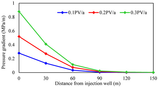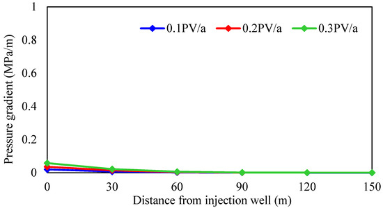As shown in Figure 22 and Table 3, injection rate has little effect on the enhanced oil recovery of gel-assisted polymer and surfactant binary flooding in the thin-oil reservoir, but has an obvious effect on the heavy-oil reservoir. The higher the injection rate, the lower enhanced oil recovery. The main reason is that with the increase in injection rate, the required displacement pressure gradient is larger, and the formation pressure gradient is established only near the injection well, which leads to exceeding the upper limit of injection pressure near the injection well, which means that the effective chemical flooding cannot be established. As a result, the injection–production ratio decreases and the effect deteriorates.