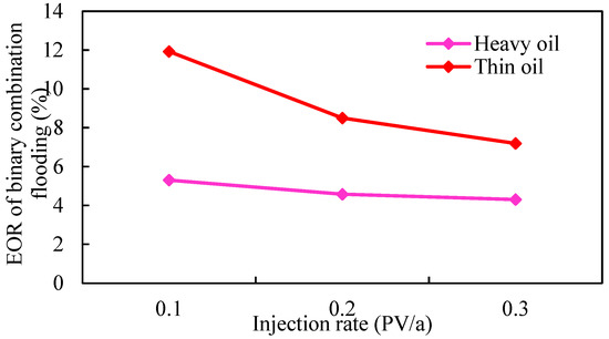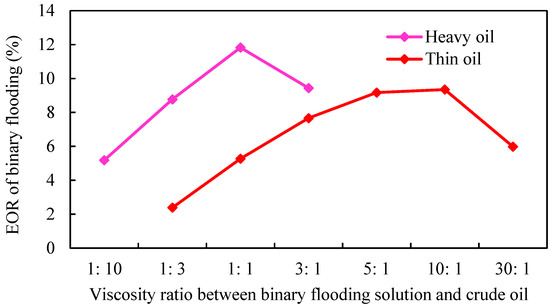 As shown in Figure 23, with the increase in the viscosity of the binary combination system, the enhanced oil recovery of binary flooding increased first and then decreased. The main reason is that the greater the viscosity ratio of displacement phase to crude oil, the greater the displacement pressure gradient. Due to the existence of external edge water energy supply, it is more difficult to establish the displacement pressure gradient in strong edge water reservoirs, which leads to the inability to establish effective chemical displacement, the decline of the injection–production ratio, and a poor displacement effect. The flow resistance of thin-oil reservoir is small, and it is easier to establish effective displacement. The optimal viscosity ratio between binary combination solution and crude oil is 5: 1. Additionally, the optimal viscosity ratio of the heavy-oil reservoir is 1:1, which is lower than that of the thin-oil reservoir.