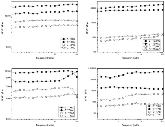 Frequency sweeps for organogels made with 5d urea (U) and 3d carbamate (C), XA-xylene-water, TDXA-toluene-dioxane-xylene-water, TXA-toluene-xylene-water and TA- toluene-water.
