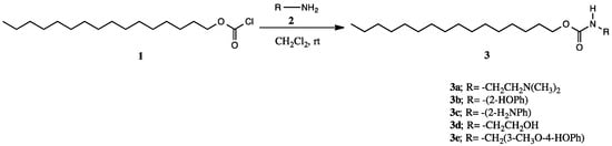 The general procedure for synthesizing the carbamates began by dissolving alkyl or aryl amines 2 (0.8 equiv.) in dichloromethane (DCM) in a round-bottomed flask under vigorous stirring. Then, hexadecyl chloroformate 1 (1 equiv.) in dichloromethane was added dropwise during 30 min at room temperature. The reaction progress was monitored by thin layer chromatography (TLC). After two hours, the reaction mixture was extracted with 5 v/v% aqueous hydrochloric acid solution (3 15 mL) and water (2 15 mL). The organic phase was dried (Na2SO4) and filtered and the solvent was evaporated under reduced pressure. The product was purified by recrystallization or by silica gel (70–230 mesh) column chromatography. The carbamates were obtained as a white or beige solid in a yield greater than 85% (see Supplementary Materials and Scheme 1).