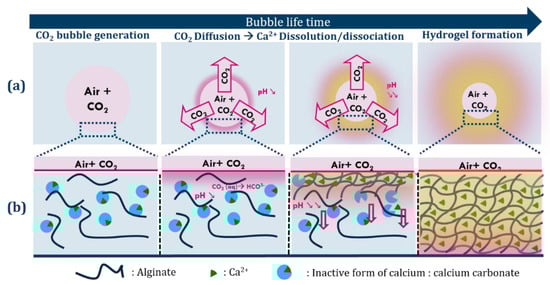 (a) Schematic representation of the internal cross-linking of alginate with inactive calcium ions (CaCO3) via acidification of the medium induced by the dissolution of CO2 from the bubbles. (b) Scheme of the diffusion of CO2 from the interface into the bulk and evolution of the gelling front with time. The growing hydrogel layer is represented in yellow.