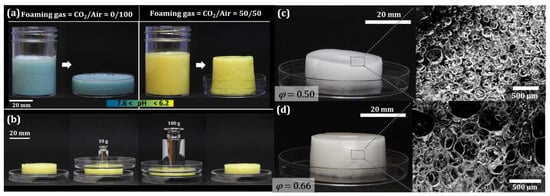 The morphology of the obtained hydrogel foams could be controlled via the gas fraction φ. Figure 2c,d show two examples at a CO2/air volume ratio of 50/50: The foam in Figure 2c was generated with φ = 0.5, while the foam in Figure 2d was prepared with φ = 0.66. One can see from the microscope images that the bubbles in the foam with φ = 0.66 (Figure 2d) are deformed into polyhedral shapes [,], while the bubbles in the foam with φ = 0.5 remain fairly spherical and are not in contact with each other, indicating a morphology closer to a “bubbly hydrogel” than a foam.