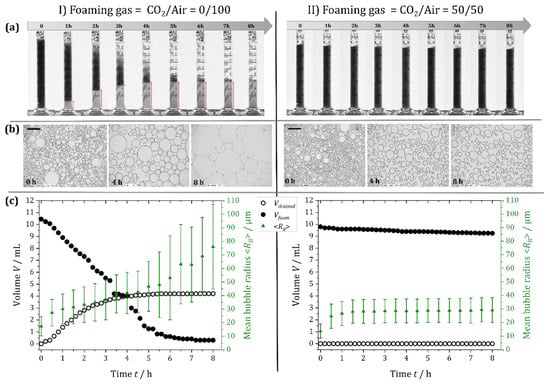 Foam stability of two alginate foams generated with (I) CO2/air = 0/100 and (II) CO2/air = 50/50. (a) Photographs of the foams taken in closed graduated glass cylinders at 1 h time intervals; the black zone corresponds to the foam, and the transparent zone at the bottom is the drained liquid. (b) Microscope images obtained over 8 h after squeezing the foam into a monolayer of bubbles between two glass plates separated by a 34 µm spacer (scale bars 500 µm). (c) Temporal evolution of the drained volume of liquid, Vdrained, and the foam volume, Vfoam, measured from (a), together with the mean bubble radius measured from (b). The error bars represent the standard deviation of the bubble sizes measured for each image.