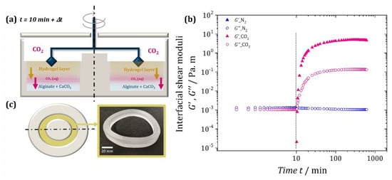 To obtain a more quantitative characterization of the interface-driven CO2-induced gelation, we characterized the interfacial properties of the alginate solution mixed with calcium carbonate microparticles using interfacial shear rheology in the absence and presence of CO2 (Section 4.2.2). The double-wall ring geometry [] of the setup is sketched in Figure 4a.