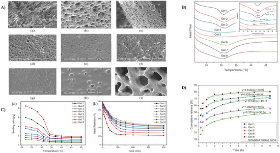 (A) SEM images of (a) Gel 1; (b) Gel 2; (c) Gel 3; (d) Gel 4; (e) Gel 5; (f,g) Gel 6; (h) Gel 7; and (i) Gel 8. (B) DSC analysis of gel phase transition characteristics. (C) (a) Temperature-dependent swelling ratios of gels between 20 and 50 degrees Celsius; (b) gel deswelling behavior at 60 degrees Celsius. (D) The simulated release curves and release behaviors of 5-FU from gels in PBS (pH 7.4) at 37 °C [177].