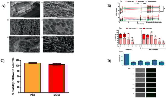 (A) SEM structural analysis of Alg-g-P (NIPAAm) hydrogels premised on (a) Algogel3001, (b) Algogel6021, (c) Satialgine S60NS, (d) SatialgineS900NS, (e) Sigma, and (f) XPU alginate. (B) As a pDNA and RALA/pDNA NPs delivery device, Alg-g-PNIPAM hydrogel was used. (a) For up to one month in DDW at 37 °C, hydrogels discharged pDNA (continuous line) at a faster rate (burst release) than RALA/pDNA NPs (dashed line). (b) DNA stability was sustained in algogel 3001-g-P (NIPAAm) hydrogels for uncomplexed pDNA for up to 10 days and complexed RALA NPs for up to 30 days; * p < 0.05. (C) Degradation of algogel 3001-g-PNIPAM hydrogel at 70 °C in cell medium for 3 days caused cytotoxicity in PC3 and MG63 cells. (D) Evaluation of DNA transfection effectiveness after 15 days of incubation in Alg-g-PNIPAM hydrogel (A) flow cytometry analysis for transfection efficiency (B) The prevalence of green fluorescent protein-expressing cells for the various treatment groups. Reproduced with permission from [211], copyright Elsevier, 2017.