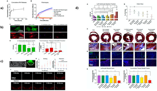 In an investigation, Mihalko et al. used fibrin-specific poly (N-isopropylacrylamide) nanogel in a projected dual-delivery technique capable of reestablishing blood flow and simultaneously inhibiting cardiac fibrosis. This system consisted of tissue plasminogen activator (tPA) combined with a cell contractibility inhibitor (Y-27632); tPA, is an enzyme responsible for clot breakdown, and Y-27632 is essential in rho-associated protein kinase (ROCK) signaling pathway inhibition. Strategically, the dual delivery system design allowed for a preliminary release of tPA to soften the prime MI fibrin deposition, trailed by an additional constant release of Y-27632 (as shown in Figure 5a) to avert cardiac scarring through obstructive critical cellular replies intricated into the onset plus development of fibrosis. The in vitro studies showed fibrin degradation with decreased cardiac cell fiber formation (as shown in Figure 5b,c). In contrast, in vivo studies demonstrated improved ventricular ejection fraction and reduced infarct size (as shown in Figure 5d), advocating the value of this therapy for improving cardiac function after a heart attack [249].