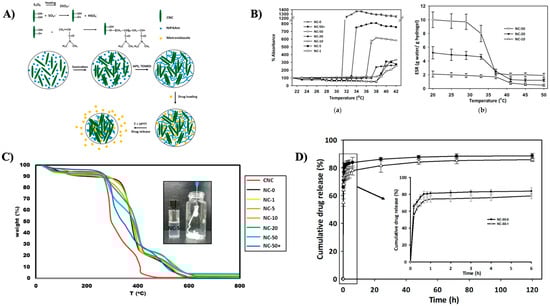 (A) The synthesis of thermoresponsive poly(N-isopropylacrylamide) (PNIPAM)-cellulose nanocrystal (CNC) hybrid hydrogels and a graphic depiction of the structural framework of drug release and drug load. (B) Thermoresponsive characteristics of PNIPAM-CNC hybrid hydrogels: (a) volume phase transition temperature (VPTT) profiles of hydrogels NC-0, NC-50+, NC-50, NC-20, NC-10, NC-5, and NC-1, with temperatures of 32, 34, 36.2, 37.5, 38.5, 39, and 39 degrees Celsius, correspondingly; (b) equilibrium swelling ratio (ESR) of PNIPAM-CNC hybrid hydrogels at various temperatures. (C) TGA thermograms of a pure CNC sample and produced PNIPAM-CNC hybrid hydrogels with varied levels of CNC content revealing thermal degradation characteristics. (D) Metronidazole (MZ) release profile from NC-50 hydrogels in phosphate-buffered saline (PBS) with pH 7.4 at 37 °C in vitro [142].