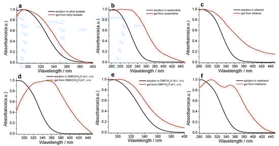 UV–vis absorption spectra of gelator 1 in solution and gel state with different solvents: (a) ethyl acetate; (b) acetonitrile; (c) ethanol; (d) DMSO/H2O (4/1, v/v); (e) DMF/H2O (4/1, v/v); (f) methanol. The concentrations of solution and gel were 10−5 M and the corresponding CGC.