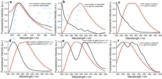 To explore the effect of solvents on gelator 1, fluorescence emission spectra of 1 in solution and gel states with six different solvents were investigated (Figure 4). In Figure 4a, solution 1 in ethyl acetate had a maximum emission peak at 402 nm with a very weak intensity, and was blue-shifted to 397 nm in the gel state, indicating the TICT behavior of gelator 1 in ethyl acetate []. Solution 1 in acetonitrile almost did not emit light, and an emission peak was at 393 nm for its gel state (Figure 4b). Similar emission behavior was observed for the gel of 1 in ethanol (Figure 4c). An emission at 342 nm of solution 1 in DMSO/H2O (4/1, v/v) was red-shifted to 393 nm with a shoulder peak of 376 nm in the gel state, which showed that π–π stacking was presented in the gel system. Two emission peaks appeared at 339 and 415 nm for solution 1 in DMF/H2O (4/1, v/v), which combined into a single broad peak at 378 nm in the gel state (Figure 4e). Two emission peaks at 358 and 393 nm of solution 1 in methanol were also changed into one peak at 373 nm in the gel state (Figure 4f). These experimental results exhibited that the solvent not only affected the self-assembly process, but also influenced the emissions.