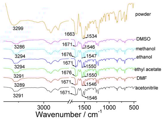 It is well known that there are one or more driving forces, such as a hydrogen bond and van der Waals force, in the self-assembly gel []. In order to analyze hydrogen bonding in the gels of 1 in different solvents, Fourier transform infrared spectra of xerogels of 1 were obtained. As shown in Figure 5, N–H stretching vibration peaks of xerogels of 1 in methanol, ethanol, ethyl acetate, DMSO/H2O (4/1, v/v), DMF/H2O (4/1, v/v) and acetonitrile were at 3294, 3294, 3291, 3286, 3259 and 3291 cm−1, respectively. Furthermore, the stretching vibration peaks of C=O (amide I and II) of xerogels of 1 in the aforementioned solvents and powder 1 were at 1676, 1671, 1676, 1671, 1671 and 1671 cm−1 and 1546, 1547, 1550, 1546, 1546 and 1546 cm−1, respectively. The results demonstrated that there were intermolecular hydrogen bonds in the gel system. The FTIR spectrum of powder 1 showed that N–H and C=O (amide I and II) stretching vibration peaks were at 3299, 1663 and 1534 cm−1, which demonstrated that a hydrogen bond also existed in the powder state.