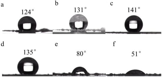 Surface wettability plays an important role in material application, especially as superhydrophobic and superhydrophilic surfaces have many potential applications [,,]. The diluted gel of 1 was spread on the glass sheet with a certain thickness to avoid the basal influence, and then dried naturally. As shown in Figure 6a–d, xerogels of 1 in DMF/H2O (4/1, v/v), acetonitrile, DMSO/H2O (4/1, v/v) and ethyl acetate were hydrophobic with water contact angles of 124°, 131°, 141° and 135°, respectively, whereas xerogels of 1 formed in ethanol and methanol exhibited superhydrophilicity with small contact angles of 80° and 51° (Figure 6e,f). For the above experimental results, it was concluded that the surface wettability of xerogels of 1 was mainly determined by their different self-assembly modes and structures due to their same components.