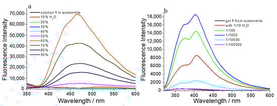 To further verify the AIE of gelator 1, the fluorescence emissions of gelator 1 in the solution and gel state with different water proportions were obtained (Figure 7). With water content up to 70%, the emission of solution 1 in acetonitrile was greatly enhanced by 75 times, and then was decreased after the water content was more than 70% (Figure 7a). The fluorescence emission change of solution 1 in acetonitrile with different contents of water was well verified by the corresponding images (Figure S2). It was regrettable that the emission light from solution 1 with 70% water was not observed under a portable UV lamp. A similar emission change was observed in the gel system (Figure 7b). When the water proportion increased from 1/100,000 to 1/1000, the fluorescence intensity of the gel of 1 also continuously increased. If the water proportion was more than 1/1000, the fluorescence intensity was gradually decreased. However, the overall fluorescence intensity was higher than that of the gel formed in pure acetonitrile. Two emission peaks appeared at 373 nm and 403 nm after the water content increased to 1/10,000.