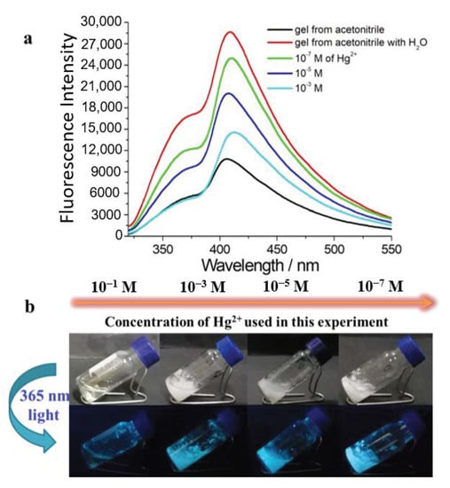 - Yang, H.-L.; Sun, X.-W.; Zhang, Y.-M.; Wang, Z.-H.; Zhu, W.; Fan, Y.-Q.; Wei, T.-B.; Yao, H.; Lin, Q. A bi-component supramolecular gel for selective fluorescence detection and removal of Hg2+ in water. Soft Matter 2019, 15, 9547–9552. [Google Scholar] [CrossRef]