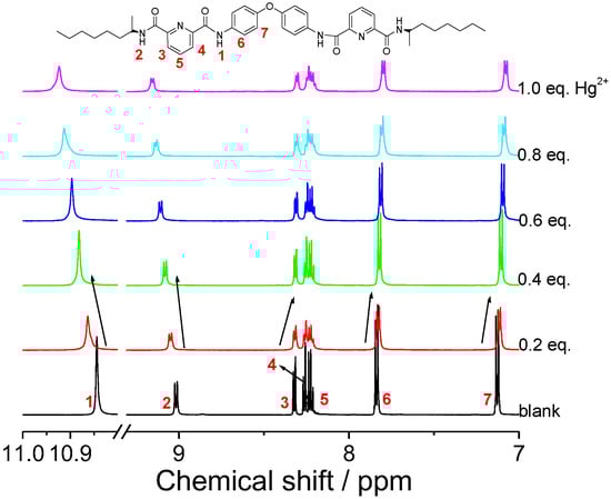 In order to study the coordination interaction between Hg2+ and the pyridine group in molecule 1 and the change in noncovalent interaction, NMR titration experiments with Hg2+ in DMSO-d6 (11.6 mM) were performed, as shown in Figure 11. Upon the gradual addition of Hg2+ to solution 1 in DMSO-d6, the chemical shifts of two active protons assigned to two amide groups (H1 and H2) were shifted downfield from 10.84 and 9.01 ppm to 10.92 and 9.15 ppm, respectively. The chemical shifts of H3–H7 of pyridine and benzene rings in molecule 1 were all moved upfield from 8.33, 8.27, 8.24, 7.85 and 7.14 ppm to 8.31, 8.25, 8.22, 7.79 and 7.07 ppm, respectively. These results indicated that hydrogen bonding in the gel system was destroyed by Hg2+, and the coordination interaction between molecule 1 and Hg2+ existed [].