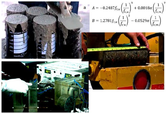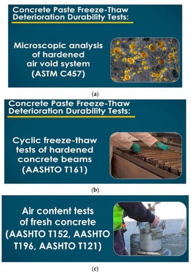 Durability test processing, (a) Microscopic analysis of hardened air void system, (b) Cyclic freeze thaw tests of hardened concrete, (c) Air content of fresh concrete.
