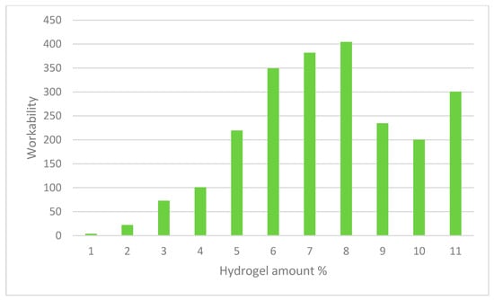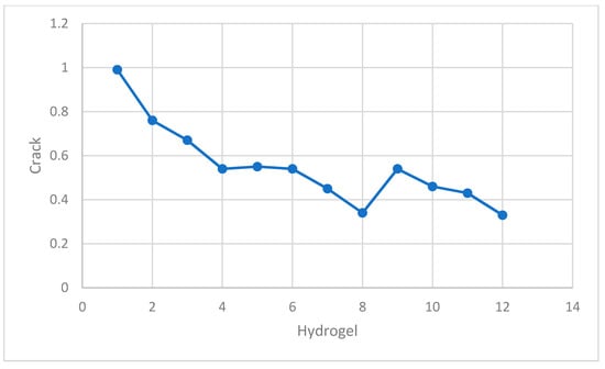 ASTM C29 was used to determine the total aggregate void content. The amount of oven dry coarse and fine aggregate needed to maintain the chosen aggregate ratio was calculated. The fine and coarse aggregates were combined together in a pan using a scoop. The blended mixed aggregate was layered thrice in a 0.33 cubic foot vessel, with each layer being rodded twenty-five times. The void content was determined using the bulk density and aggregate relative density measurements. The test was carried out thrice with different batches each time. The mixed aggregate’s average void content was determined to be 25.4 percent. Many various molarity aluminum solutions were created, and gravimetric measurements were made to further explore the impacts of aluminum on swelling responses along with hydrogel mechanics. Lastly, the elastic modulus of hydrogels expanded in 0.025 M aluminum solution was calculated as a function of time. The kinetics of swelling was also altered. At a concentration of 0.005 M, all hydrogels exhibited a brief peak of swelling (5 min) followed by consistent deswelling for the rest of the experiment. Table 2 shows mixture proportions for pastes with and without hydrogels across all samples. WRA is percent by weight of cement. Q is swelling ratio obtained in pore solution at 4 h after immersion following the study []. Figure 7 shows that the application of hydrogel in concrete reduces shrinkage and cracking. Figure 8 also shows that the interactions of alkaline cementitious mixes and hydrogel nanoparticles on the swelling and curing behavior increase the elimination of voids in the admixture. Figure 9 shows that the application of hydrogel stabilizes the workability level, irrespective of the w/cm by means of a minimal paste to void ratio.