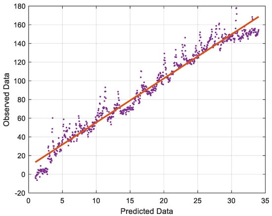 Upon assessing the ANN’s included parameters, its performance in terms of previously defined performance measures was evaluated during the training and testing stages (Table 3). The goodness of fit models in the testing of half of the data were chosen as the major criteria to evaluate the performance of both models in terms of prediction accuracy. ANN has an associated RMSE score of 0.543. The associated R2 values for ANN are 0.984. The optimum model for forecasting compressive strength and concrete durability as well as measuring voids while utilizing hydrogel was identified by contrasting values of RSQR and RMSE. Based on the figure, it appears that the density of color dots across the regression line is acceptable in this situation. It demonstrates ANN’s goodness. In addition, the image depicts the ANN’s RMSE, which demonstrates its correct performance. Going through Figure 11, there is a good correlation between the colored and blue line, showing the properness of the model in this analysis. In this figure, the horizontal axis shows the data number, and the vertical axis shows the RMSE values (−80 to 80). In Figure 12, the distribution of data on the regression line is represented. There is some noise on the regression line; the closer the noise is to the cross line, the more accurate the model is.