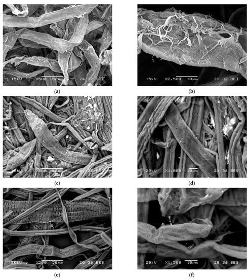 Scanning electron microscopy of plant cell walls at different magnifications. (a) General view of softwood fibers (magnification 500×). (b) Broken ends of softwood fibers (magnification 2500×). (c) Cellular elements in rapeseed pulp (magnification 550×). (d) Fibers in rapeseed pulp (magnification 1000×). (e) Perforations in corn fibers (magnification 500×). (f) Fibers in corn pulp (magnification 1500×).
