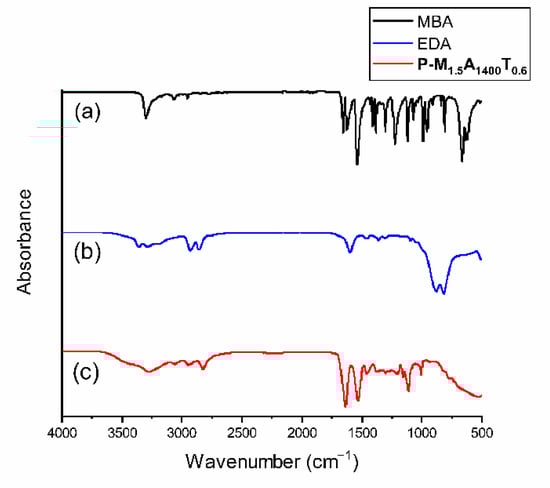 ATR-FTIR spectra of methylenebiscrylamide (a), ethylenediamine (b), and poly(amidoamine) particles (P-M1.5A1400T0.6) (c).
