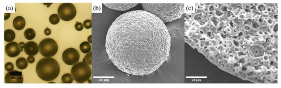 Ethylenediamine (EDA), N,N’-methylenebisacrylamide (MBA), poly(vinylalcohol) (PVA) (Mw = 89,000–98,000 g/mol), and Span 60® were purchased from Sigma-Aldrich (Boston, MA, USA). Methanol (MeOH), toluene, and cyclohexane were purchased from Junsei (Chuo-ku, Tokyo, Japan). All reagents were used as received without further purification. A 5L Chemglass ChemRxnHub (Vineland, NJ, USA) Process system was used in the scale up process. Images of the particles were obtained by Nikon ECLIPSE ME600 (Tokyo, Japan) optical microscopy (OM), FEI Nova230 (Hillsboro, OR, USA), and JEOL JSM IT800 (Akishima, Tokyo, Japan) scanning electron microscopy (SEM). EDS analysis was conducted by a Bruker Quantax ESPRIT (Billerica, MA, USA) attachment. CO2 was measured by DS6200 gas chromatography (DS Science Inc.; Gwangju-si, Gyeonggi-do, Korea).