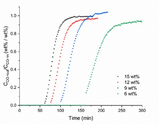 To measure the CO2 absorption capacity of the hydrogel particles, water-soaked porous HPAMAM particles (P-M1.5A1400T0.6-2L) packed in a 60 cm column were used with a continuous flow of CO2. A schematic illustration of the column and a photograph of the experimental setup are shown in Figure 4. We used a column with a pocket where water can be circulated to control the temperature of the column at 50 °C. For the measurement, 45 g of porous PAMAM particles (P-M1.5A1400T0.6-2L) was used at various CO2 concentrations (6, 9, 12, and 15 wt%) with a gas flow rate of 150 mL/min (Figure 5). The concentration of outlet CO2 gas was measured by gas chromatography at 25 °C. The porous HPAMAM hydrogel particles exhibited 2.374 mol/kg of CO2 sorption (104 mg/g) within 60 min for saturation at 15 wt% CO2 concentration while the sorption value was 2.150 mol/kg and 100 min for saturation at 9 wt% CO2. These values are comparable to the reported values of amine-modified mesoporous silica (1.36–2.59 mol/kg) [,,].