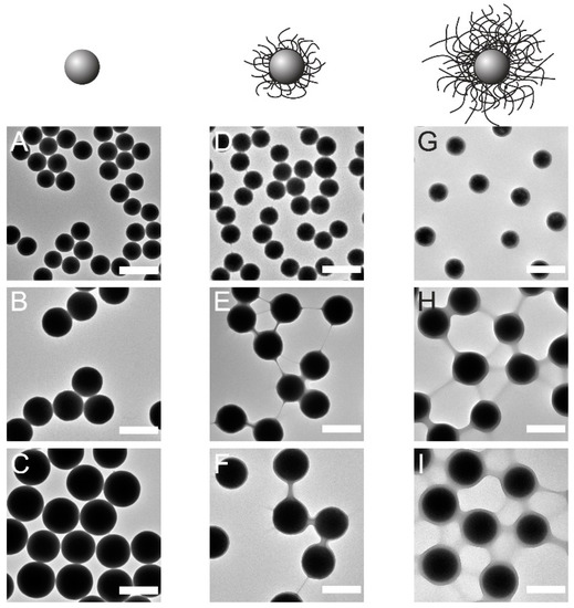 TEM images of CS microgels with variously sized cores: C245 (A), C388 (B), and C455 (C), with thin shells: C245S1.7 (D), C388S2.1 (E), C455S2.1 (F) and with thicker shells: C245S2.9 (G), C388S2.6 (H), C455S2.3 (I). The scale bars correspond to 500 nm.