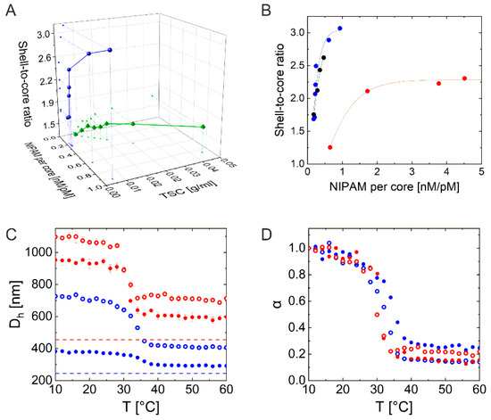 Figure 2A shows a 3D plot of shell growth on C245 in terms of δ as a function of NIPAM concentration per number of core and TSC. The blue spheres represent data for CS microgels synthesized without surfactant in the low TSC regime, using an overhead stirrer (the proposed synthesis protocol), while the green tetrahedrons correspond to results from synthesis with surfactant (sodium dodecyl sulfate-SDS, 2 mM) in the high TSC regime, using a magnetic bar for stirring (following the protocol from [24], labeled as CxSy-C for Core-Shell-Conventional). More details on the effects of the individual synthesis parameters such as SDS concentration, stirring method, and temperatures on the overall size of the CS microgels can be found in SI. Figure 2B shows the shell growth in terms of δ as a function of the NIPAM concentration per number of silica cores for the three different core sizes (see Figure 1) performed via the proposed synthesis protocol at low TSC in the absence of SDS under more efficient stirring. The results show that the synthesis protocol can also be transferred to significantly larger cores. The shell growth of all CS microgels can be described by an exponential growth as a function of monomer concentration per number of cores (fitted with the Gompertz fit, solid lines). This enables us to predict the total microgel sizes for any given feed concentration, at least in the studied range. At the same time, desired values of δ can be specifically targeted. Figure 2C shows the swelling curves of the four selected CS microgels recorded by temperature-dependent DLS: CS microgels with the small core with thin shell C245S1.7 (filled blue) and thick shell C245S2.9 (empty blue) and the large core with thin shell C455S2.1 (filled red) and thick shell C455S2.3 (empty red). In all cases, we find the typical volume phase transition (VPT) behavior with a continuous decrease in hydrodynamic diameter with increasing temperature in the vicinity of the volume phase transition temperature (VPTT). Here, we want to note that our larger CS microgels seemed to be under the effect of gravitational settling during the DLS measurements, which could be the reason for their higher polydispersities (or overestimation of polydispersity) compared to the smaller microgels. Although the commonly quoted upper size limit for DLS is around 10 μm, it often is only achievable by increasing the viscosity of the continuous phase or by using capillary DLS [25,26]. In this study, however, we do not further discuss the matter and report the Dh values as recorded and used for the calculation of δ. The calculated de-swelling ratios (α) of the corresponding CS microgels appear to overlap rather well as depicted in Figure 2D. The de-swelling ratios α were calculated as: