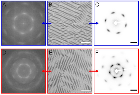 To study 2D assemblies of the CS microgels, we prepared hexagonally ordered monolayers using interface-mediated self-assembly and subsequent transfer to glass substrates. The monolayer assembly is also an effective way to judge their collective behaviors as well as the monodispersity. The samples were transferred to the substrates at surface pressures of approximately 20 mN/m, i.e., at relatively high pressures, where the CS microgels are already in shell-shell contact and squeezed against each other. More information on the sample preparation can be found in the Section 4 and in SI. We prepared monolayers from CS microgels with the smallest (C245S2.9) and largest cores (C455S2.3) investigated in this study. Figure 3B,E show optical light microscopy images of the samples at 100× magnification. For both samples, this magnification is clearly sufficient to resolve single particles. Furthermore, the hexagonal order becomes evident, which is also reflected by the six-fold symmetric fast Fourier transformations (FFTs) shown in (Figure 3A,D). While the microscopic images cover areas on the order of 0.01 mm2, we can probe significantly larger areas over 1 mm2 when using SALS on the same samples. Figure 3C,F show the recorded diffraction patterns. In both cases, we again see six-fold symmetries, which are in very good agreement with the FFTs computed from the real space images. Thus, optical microscopy and SALS can deliver complementary information despite the different areas probed. We want to highlight that typically microgel and CS microgel assemblies were studied using scattering techniques based on neutrons and/or X-rays (mostly SANS and SAXS) in the past years and/or by rather high-resolution microscopies such as AFM and scanning electron microscopy (SEM). Being able to use light for the structural investigation offers great possibilities for investigation of microstructures and phase transitions in real time being independent of large-scale facilities and expensive setups.