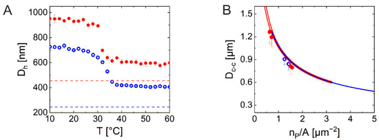 (A) Evolution of the hydrodynamic diameter (Dh) for C245S2.9 (blue) and C455S2.3 (red) as a function of temperature. The dashed, horizontal lines correspond to the respective core diameters measured by TEM. (B) Calculated interparticle distance (Dc-c) against the number of particles per unit area (nP/A) for 2D compression accounting for an area fraction of 0.91 (solid lines, blue: C245S2.9, red: C455S2.3). Symbols with error bars: measured data at three different surface pressure (10, 20, and 30 mN/m, blue: C245S2.9, red: C455S2.3).