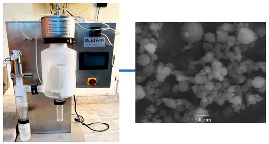 Photograph of spray dryer and SEM of 5FU-Alg-Np.