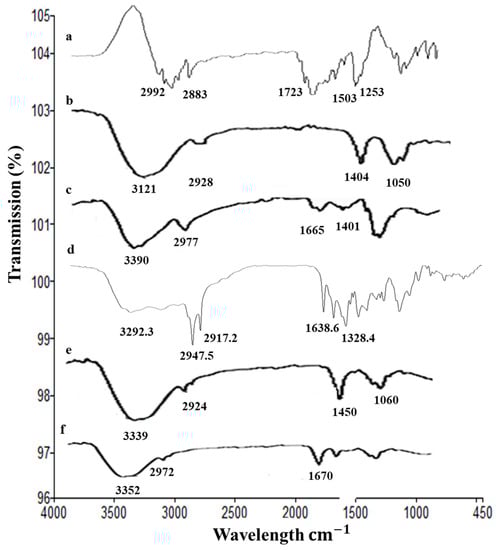 ATR-FTIR spectra of (a) 5FU, (b) alginate, (c) chitosan, (d) gelatin, (e) 5FU-Alg-Np, and (f) 5FU-Alg-Np-HG.